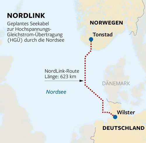 NordLink海底電纜的整個長度為623 km,包含陸地電纜部分。該項目由挪威國家電網Statnett和DC Nordseekabel GmbH&Co KG一起開發施行。后者是由滕特和德國開發銀行KfW一起具有的合資企業。