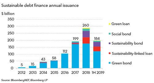 本年上半年,全球可繼續(xù)債款融資體現(xiàn)搶眼,創(chuàng)下新的紀錄,到達1840億美元,包含綠色債券,綠色借款,可繼續(xù)借款等。一般來說,上半年的體現(xiàn)比下半年安靜。所以,即便2019年終究六個月的發(fā)行利率堅持不變,估計全年至少可以獲得3800億美元的可繼續(xù)債款融資,2018年全球可繼續(xù)債款融資達2600億美元。